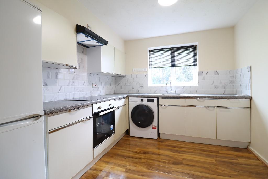 Measuring 10' 6" x 8' 5" Range of fitted wall and base units, laminate roll top work surfaces, part tiled walls, stainless steel single sink unit with drainer, electric oven beneath, extractor above, double glazed window to rear. space for fridge freezer, space and plumbed for washing machine, laminate floor.